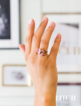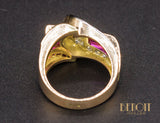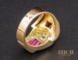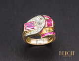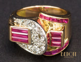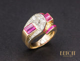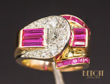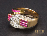 Bague de pur style Art Déco Moderniste de la période Tank, en or rose 750/1000e, formée de différentes formes géométriques serties de diamants en grains sur réhaut de platine et de baguettes de rubis verneuil. Corps de bague large et plat. Très beau bijou, recherché.