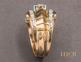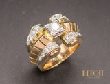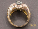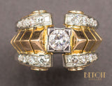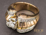 Bague en or rose 750/1000e de style et d'époque Tank, formant quatre rouleaux réhaussés de platine et sertis de diamants, séparés par une rangée de volumes pyramidaux en or. Au centre, un diamant taille brillant est serti sur un carré de platine. Bijou volumineux, de très belle facture, au très beau design Art Déco Moderniste.