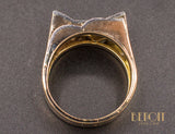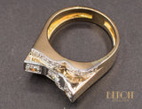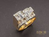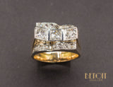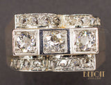 Bague en or rose 750/1000e de style Art Déco Moderniste composée d'un élément central en hauteur serti de trois diamants d'environ 0,15 carat chacun sertis dans trois carrés de platine disposés en cuve. Répété en haut et en bas, un motif grimpant et pavé de diamants sur platine encadre le bandeau central. Très beau travail, typique de la fin des années 1940.