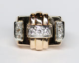 Bague en or rose 750 millièmes de style Art Déco Moderniste période Tank. Au centre d'une bande d'or incurvée sont disposés trois diamants taille ancienne sertis grains sur une bande en platine disposée en pont par dessus 3 bandes en godrons d'or rose. L'ensemble est épaulé de deux rangées de diamants taille rose serti sur platine en grains et millegrains. Corps de bague large en fuite. Beau bijou en bon état.
