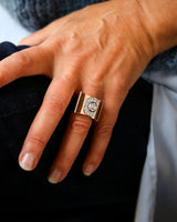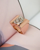 Bague Tank en or rouge 750 millièmes, large représentant comme un livre fermé avec un fermoir en forme de demi-arc, dont le poussoir est orné d'un diamant taille ancienne (teinté) serti griffes large sur un clos au centre d'une bande courbe pavée de diamant taille ancienne serti grain et filet le tout sur platine. Bague sobre mais magnifiquement mise en valeur par ses volumes et ses formes. Très bon état.