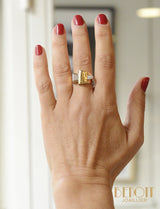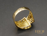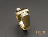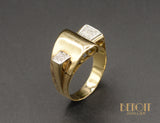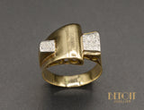 Bague Tank Art Déco en or jaune 750 millièmes, dont le plateau est composé de plusieurs volumes géométriques sertis de diamants sur platine représentant comme un fermoir. Les côtés de bague sont ajourés et agrémentés de motifs ronds. Corps de bague large.