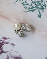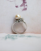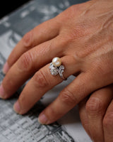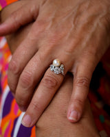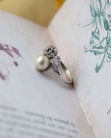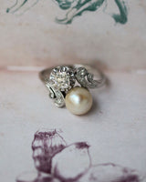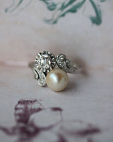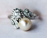 Bague Toi & Moi en or blanc 750/e ornée d'un diamant taille coussin taille ancienne serti griffes sur chaton gaufré et d'une perle de culture d'une jolie couleur nacre. De part et d'autre, l'anneau de la bague est ouvragée de volutes serties de diamants taille brillant. Corps de bague fin et plat.