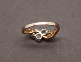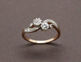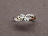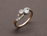 Bague style "Toi et Moi" en or rose 750/1000e et platine, ayant en son centre deux diamants taille ancienne d'environ 0,20 carat chacun, sertis sur chatons 8 griffes. De part et d'autre des diamants, les volutes du corps de bague sont sertis de diamants taille rose d'un poids total estimé à 0,15 carat.