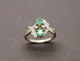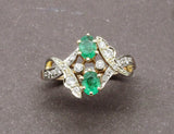 Bague toi et moi, composée de deux émeraudes ovales serties griffes, accompagnées de part et d'autres d'arabesques serties de diamants. la monture est en or jaune 750/1000e réhaussée d'or blanc sous les diamants.