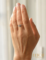 Bague Toi et Moi en or blanc 750 millièmes sertie d'un saphir rond et d'un diamant taille brillant sur chatons six griffes, suivi de trois diamants taille brillant, de part et d'autre, sertis également sur griffes. Le corps de bague, fin, se croise à la manière d'un Toi et Moi.