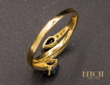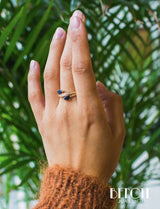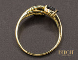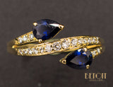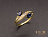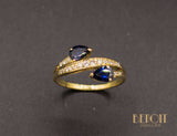 Bague Toi et Moi en or jaune 750/1000e, ornée de deux saphirs poire bleu foncé se faisant face, sertis chacun sur trois griffes et accompagnés de petits diamants. Les saphirs sont séparés par une bande d'or également sertie de diamants. Bijou au design léger et délicat.