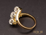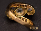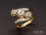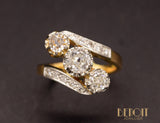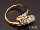 Bague en or jaune 750/1000e ornée en son centre de trois diamants taille ancienne sertis dans des chatons gaufrés 6 griffes de platine disposés en diagonale et autour desquels s'enroule le corps de bague réhaussé en partie de platine serti de diamants taille ancienne. Corps de bague en or rose 750/1000e section carrée. Bâtés des chatons principaux en or jaune 750/1000e.