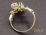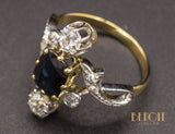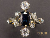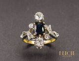 Bague en or jaune 750/1000e ornée d'un saphir coussin bleu marine d'environ 1,20 carat serti sur 8 griffes, accompagné de deux diamants taille ancienne d'environ 0,25 carat chacun sertis sur chatons 8 griffes de platine. De part et d'autre de la tête de bague, un motif représentant une boucle de ruban est serti de diamants taille rose et réhaussé de platine. Anneau simple, demi-jonc. Bijou rare, de très belle facture, très élégant.