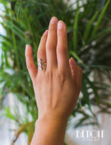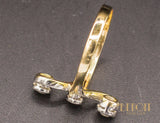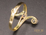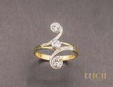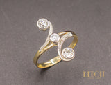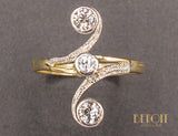 Bague en or jaune 585/1000e dont la tête de bague est réhaussée de platine. Un diamant d'environ 0,10 carat est serti en clos au centre de la tête de bague, accompagné de deux diamants d'environ 0,20 carat sertis en clos au bout de deux spirales ouvragées et guillochées. Bijou rappelant le style des bijoux des années 1900, mais daté des années 1960. Anneau simple et plat.