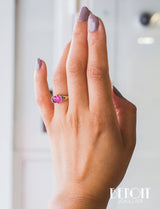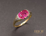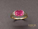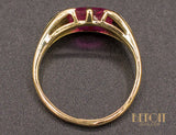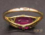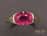 Bague en or jaune 750/1000e ornée d'un rubis verneuil taille coussin, serti par deux griffes et épaulé de deux triangles réhaussés de platine, sertis de diamants taille rose. Bijou délicat et fragile.