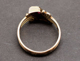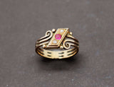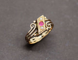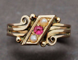 Bague en or jaune 750/1000e, ornée en son centre d'un parallèlogramme orné de deux demi-perles fines et un rubis verneuil. Corps de bague en fils carrés avec une volute de chaque côté.