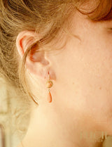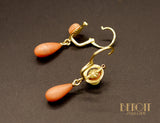 Boucles d'oreilles dormeuses en or jaune 750 millièmes composées d'un perle ronde de corail ornée d'un entourage d'or finement gravé auquel est suspendu un perle goutte de corail. Systèmes brisures (se fermant à l'avant) pour oreilles percées se refermant au dos d'un diamant taille serti en clos.