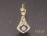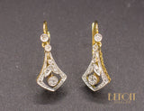 Boucles d'oreilles dormeuses en or jaune 750/1000e, composées chacune d'un élément ajouré réhaussé de platine orné d'un motif de feuilles, serti de petits diamants taille rose, articulé sous un diamant taille rose serti en clos de platine. Les flancs de l'élément principal sont ouvragés et ajourés. Travail très fin et délicat.
