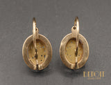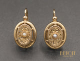Boucles d'oreilles dormeuses anciennes en or rose 750/e. Sur chacune, un ovale ajouré d'arabesques dont le centre est orné d'une demi-perle fine et entouré d'un ovale d'or tenu par des billes d'or rose. Une demi sphère d'or surmonte le tout et masque habilement le départ de la tige du système dormeuse se fermant par l'avant.