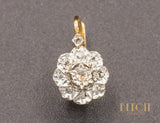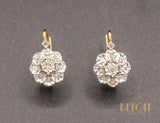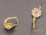 Boucles d'oreilles dormeuse en or jaune 750/1000e composées chacune d'un motif de fleur serti de diamants taille rose surmonté d'un diamant taille rose seul, le tout serti sur réhaut de platine.