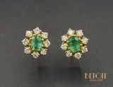 Boucles d'oreilles en or jaune 750 millièmes de style marguerite, avec en son cœur, une émeraude ovale d'un vert limpide, entourée de diamants taille brillant, le tout serti sur griffes. Système pour oreilles percées à fermoirs larges à vis.