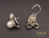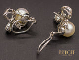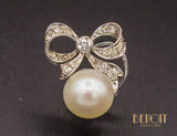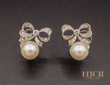 Boucles d'oreilles en or blanc 750/1000e formant un joli noeud pavé de diamants brillants en grains au centre duquel est serti en clos un diamant brillant plus important. Chaque noeud orne une jolie perle de culture blanche. Système raquette pour oreilles percées contemporain.
