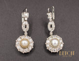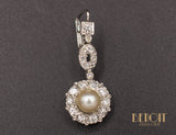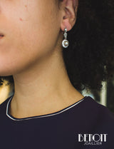 Boucles d'oreilles pendantes en or blanc 375/1000e (9K) ornées chacune d'une perle de culture blanche entourée de diamants, le tout suspendu sous différents éléments géométriques sertis de diamants, articulés entre eux. Systèmes pour oreilles percées. Bijoux de facture probablement étrangère.