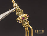 Paire de boucles d'oreilles anciennes en or rose, jaune et vert 750/1000e montées à partir d'éléments de chaîne de montre à gousset de forme géométrique ceinturée par une bande sertie de tourmalines en clos, le tout monté sur des morceaux de chaîne type renard. Systèmes col de cygne neuf en or jaune 750/1000e réalisés par nos soins.