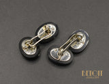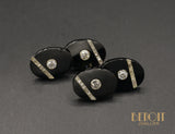 Boutons de manchette de style et d'époque Art Déco, en or blanc 750 millièmes, dont les plateaux de forme ovale sont ornés d'une plaque d'onyx sertie en leur centre d'un diamant taille ancienne en clos. Plateaux traversés par une ligne pavée de diamants. Les motifs sont maintenus par deux grâce à un système d'accroche amovible. Joli détails de millegrain.