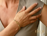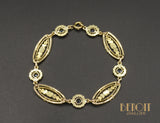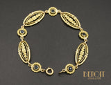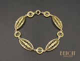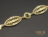 Bracelet en or jaune 750 millièmes composé, en alternance, de maillons ovales ouvragés de fils et formes végétales, et de maillons ronds sertis de saphirs ronds d'un beau bleu intense, entouré d'une couronne. Maillons assemblés par des anneaux d'or rose 750 millièmes. Fermoir rond anneau ressort.