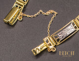 Bracelet de style et d'époque Art Déco, composé de maillons rectangulaires en or jaune 750/1000e ajourés, ornés au centre d'un plaque rectangulaire d'or blanc 750/1000e gravée de motifs géométriques. Bijou de très belle facture, délicat et fragile.