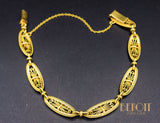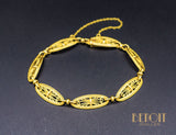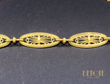 Bracelet en or jaune 750/1000e composé de sept maillons ovales travaillés de fils, reliés entre eux par un double anneau. Le fermoir cliquet est caché dans un des maillons, sécurisé par une chaîne. Poinçons tête d'aigle. Beau travail, bijou élégant.