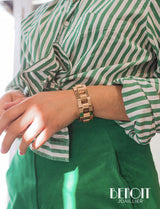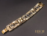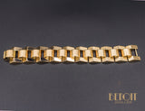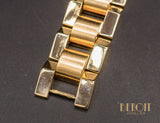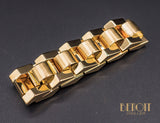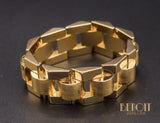 Bracelet Tank en or rose 750/1000e (18K) composé d'éléments géométriques, dont les éléments centraux en demi cylindres au fini brossé sont encadré dans des motifs géométriques au fini poli, le tout entièrement articulé. Bijou emblématique de la période Tank des années 1940. Poinçon tête d'aigle.