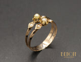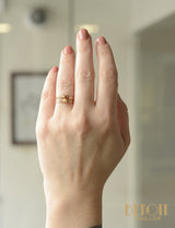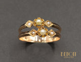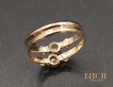 Bague de jeune fille en or rose 750 millièmes composée d'un double anneau. Au centre de chaque anneau est sertie une perle fine sur chaton gaufré. Deux losanges, sertis d'une perle fine plus petite, encadrent les têtes de bague. Corps de bague fin, biseautés et en quinconce.