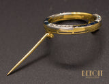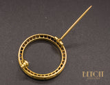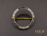 Broche cercle en or jaune 750/1000e sertie de saphirs calibrés alternés par des diamants taille rose sertis sur réhauts de platine. Travail de millegrain et envers du bijou orné de mises à jour. Broche typique de la période Art Déco.
