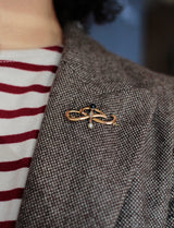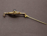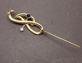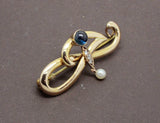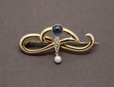 Broche ancienne composée d'une volute d'or jaune 750/1000e surmontée d'un saphir cabochon en serti clos sous lequel descend un élément d'or serti de 3 diamants taille rose, terminé par une perle fine mobile. Bijou au design Art Nouveau. Épingle de la broche en métal.