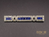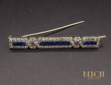 Broche barrette de style et d'époque Art Déco en platine, représentant un ruban croisé pavé de diamants taille ancienne pour environ 1,80 carat au total, enserrant des calibrés de saphir bleu roi (environ 2 carats au total). Bijou de très belle facture, très élégant.