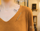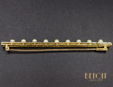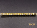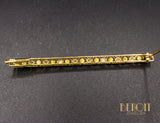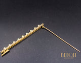 Broche barrette en or jaune 750/1000e réhaussée de platine où d'enchainent des perles fines entre lesquelles un losange serti d'un diamant taille rose est maintenu par quatre fils couteau. Pique en or rose 750/1000e. Très beau travail, très fin. Poinçons aigle sur le bâté et sur la pique.