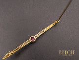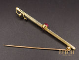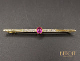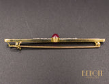 Broche barrette en or jaune 750/1000e, datant des années 1920. En son milieu est serti un cabochon de grenat serti dans un clos à millegrain, épaulé de chaque côté de cinq diamants taille rose sertis sur réhaut de platine, interrompu par une forme qui annonce le style Art Déco. Travail de mises à jours sur l'envers du bijou et système pique renforcé et protégé. Pique en or rose 750/1000e.