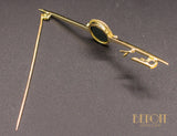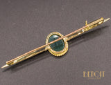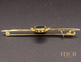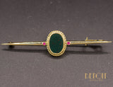 Broche barrette en or jaune 750/1000e ornée d'un jaspe vert tacheté de rouge, taillé en plaque ovale, serti en clos ouvragé de stries, entouré d'une torsade d'or. De chaque côté du jaspe deux petits rubis rose sont sertis en clos. La barrette d'or se termine en pointe aux extrémités.