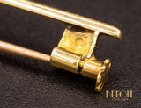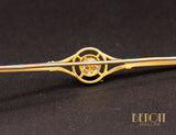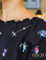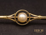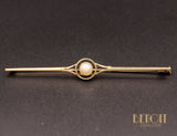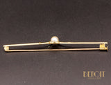 Broche barrette en or jaune 750/1000e dont le centre est orné d'une demie perle fine blanche posée au centre d'un cercle fin d'or, maintenu entre deux barres qui se divisent en leur milieu. Pique en or rose 750/1000e.