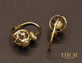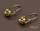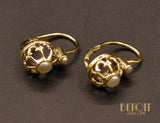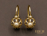 Dormeuses anciennes en or jaune 750 millièmes ornées de demi-perles sur chatons décorés avec détails de millegrain, surmontées de demi-perles, plus petites, serties en clos millegrainés. Systèmes pour oreilles percées, fermeture à l'avant.
