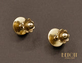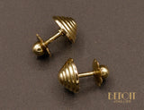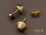 Puces d'oreilles Art Déco en or jaune 750 millièmes formées d'un motif pyramidal en plusieurs strates. Systèmes de tiges filetées avec fermoirs à vis à l'ancienne pour oreilles percées. Bijou minimaliste.