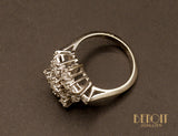 Bague en or blanc 750 millièmes ornée d'un plateau rappelant un flocon de neige composé d'un diamant central entouré d'autres diamants, certains donnant l'illusion de diamants taille navette, sertis à différentes hauteurs, le tout sur griffes avec un travail de fils au niveau du panier. Corps de bague simple, biseauté.