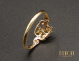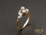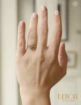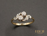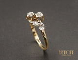 Bague de Jeune Fille en or rose 750 millièmes, de style Toi et Moi, sertie de deux Diamants taille rose en clos et griffes en platine, placés l'un au dessus de l'autre. Encadrant le motif principal, deux volutes rehaussées de platine serties de diamants taille rose débutent le corps de bague fin.