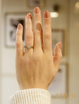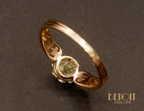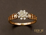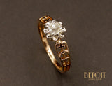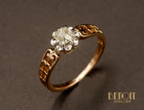Bague en or rose 750 millièmes sertie en son centre d'un diamant taille ancienne taille coussin sur chaton gaufré de platine. De chaque côté le corps de bague est joliment repercé d'arabesques. Bijou fin de belle facture.