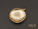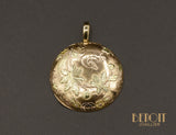 Pendentif en or rose 750 millièmes réalisé à partir d'un dos de montre à gousset ancienne entièrement décoré de motifs floraux réhaussés de détails en or jaune 750 millièmes. Bélière en or jaune 750 millièmes bombée à l'avant et plate à l'arrière.