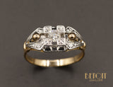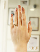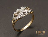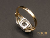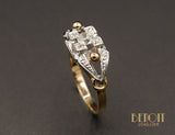 Bague Art Déco en or rose 750 millièmes dont la tête de bague est serti d'un diamant taille ancienne par quatre griffes carrées de platine, épaulé de doubles palmettes, le tout en platine, ornées de billes et terminées par de petits anneaux d'or rose 750 millièmes. Corps de bague fin et plat.