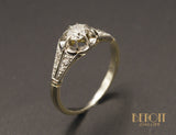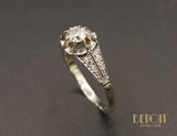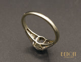Solitaire en or blanc 750 millièmes rehaussé en son centre d’un diamant taille moderne serti sur un chaton gaufré huit griffes de platine, agrémenté de chaque côté par deux palmettes en fuite pavées par deux diamants demi-taille.
