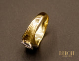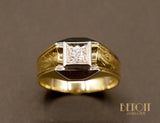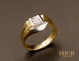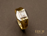 Chevalière en or jaune 750 millièmes sertie d'un diamant taille ancienne sur carré d'or blanc 750 millièmes souligné par deux trapèzes. De chaque côté, le corps de bague est ornementé de gravure encadrées par deux lignes. Bijou mixte.