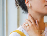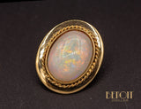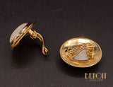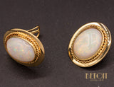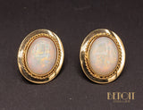 Paire de clips en or rose 750/1000e ornés en leur centre d'un cabochon d'opale blanche serti dans un clos souligné d'un fil torsadé, posé sur un plateau ovale épuré. Système pour oreilles non percées. Bijoux d'inspiration XIXe.