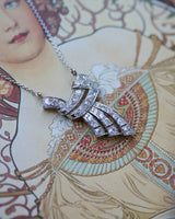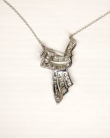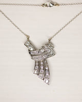 Ancienne broche transformée en pendentif, en platine 850/e, des années 1930. Représentant un nœud d'écharpe, le pendentif est sertis de diamants taille 8/8 et taille Ancienne, en grains souligné de filets lisses. Chaîne forçat ronde, neuve, en or blanc 750/e. Bijou en excellent état.