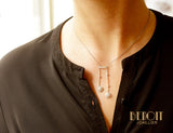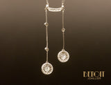 Collier dit "négligé" en or blanc 750 millièmes, composé d'une forme arquée sertie de diamants taille rose sertis par des grains. À cette forme sont suspendues deux fils couteaux articulés de longueurs différentes et ornées de deux diamants pour l'une et d'un pour l'autre, sertis en clos. Au bout de ces deux tiges sont sertis deux diamants taille ancienne d'environ 0,45 carat. Pendentif sur chaîne d'origine, fine et aux maillons de forme Art Déco.