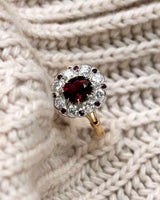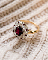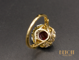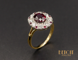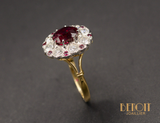 Magnifique bague Pompadour en or jaune 750 millièmes, dont le plateau est rehaussé d'or blanc 750/e. Au centre, un Rubis ovale, certifié CGL, est serti sur 8 griffes, entouré de 8 diamants taille brillant en clos perlés et 8 Rubis ronds sertis en grains, reposant sur un panier ajouré de volutes. Corps de bague fin.